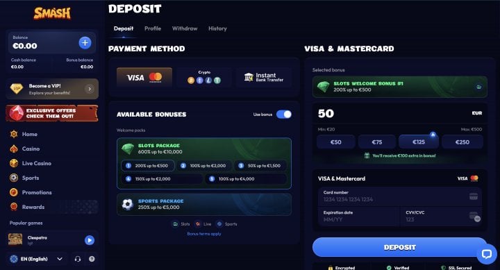 Smash Casino Welcome Bonus: Up to 10,000 EUR / 15,000 CAD / 10,000 AUD