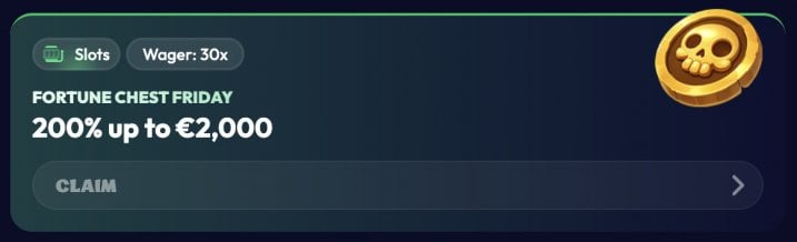 - Fortune Chest Friday: A 200% bonus reaching up to 2,000 EUR / 3,000 CAD / 2,000 AUD.