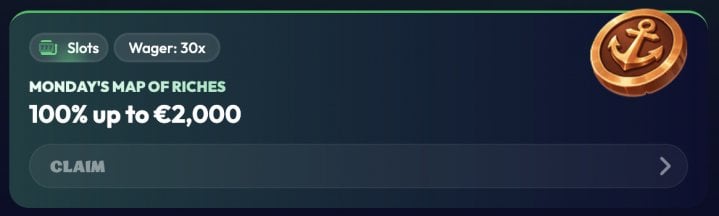 - Monday's Map of Riches: A 100% deposit match going up to 2,000 EUR / 3,000 CAD / 2,000 AUD.