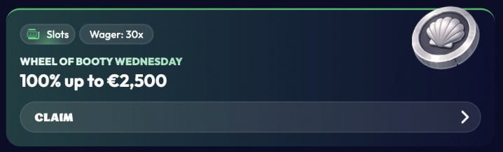 - Wheel of Booty Wednesday: A 100% bonus that caps at 2,500 EUR / 3,750 CAD / 2,500 AUD.