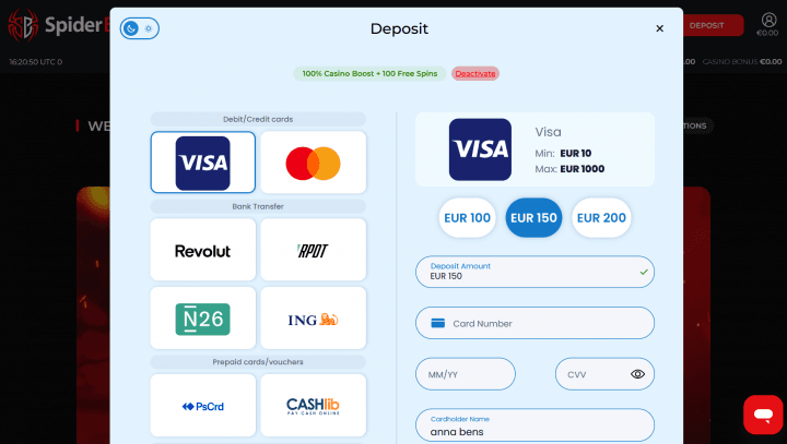 SpiderBets Casino Welcome Package- up to 1,150 EUR / 1,725 CAD / 1,725 AUD / 2,300 NZD + 300 Free Spins