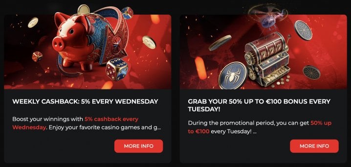 - Weekly Cashback: You receive 5% of your net real money losses from Wednesday to Tuesday. The maximum cashback is 5,000 EUR / 7,500 CAD / 7,500 AUD / 10,000 NZD, with a 1 EUR / 1.5 CAD / 1.5 AUD / 2 NZD minimum. It’s credited as real money with no strings attached.