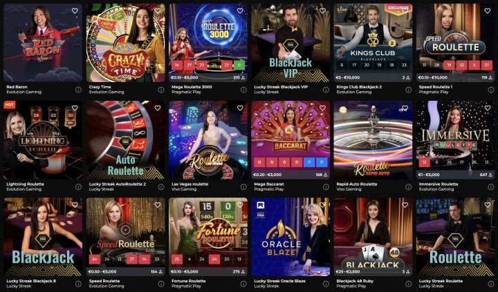 - Game Shows: You’ll find popular games like Crazy Time, Red Baron, Monopoly Live, and Mega Wheel.