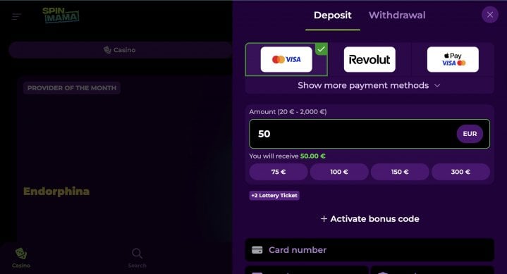Banking at SpinMama varies quite significantly depending on where you're playing from – what's available in Europe looks very different from what Canadian or Australian players see in their cashier.