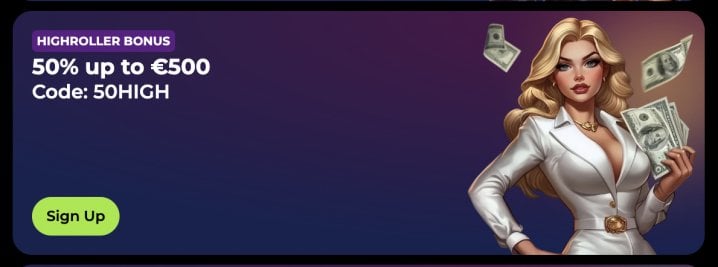 The High Roller Bonus runs every seven days and offers 50% up to €500 / C$750 / A$1,500, with minimum deposits of €300 / C$300 / A$300, respectively. Wagering is 35x bonus, validity is three days. EUR code: 50HIGH, AUD code: HIGHT. Not available for Finnish players. The “High Roller” label is generous here. The bonus offers less upside than the first welcome deposit while demanding a much higher minimum deposit, making it feel more like a standard reload than a premium high-stakes reward.