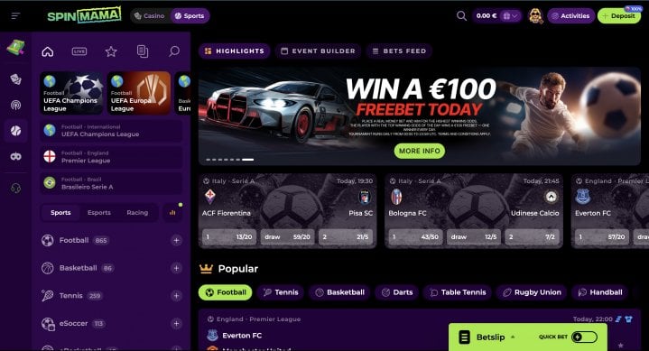 SpinMama's sportsbook covers 40+ sports with football leading at 1,551 markets, followed by basketball (435), ice hockey (280), volleyball (224), and tennis (123). Esports coverage is broad – eSoccer, eBasketball, eFighting, and eCricket, among others. Live betting and a ComboBoost accumulator multiplier of up to 1.5x are both available. Casual bettors will find plenty of variety here.