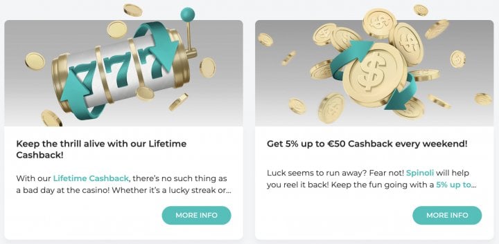 For players who deposit weekly, Spinoli offers a mix of reload bonuses and cashback, with the cashback being particularly valuable as it helps offset losses over time without any wagering requirements.