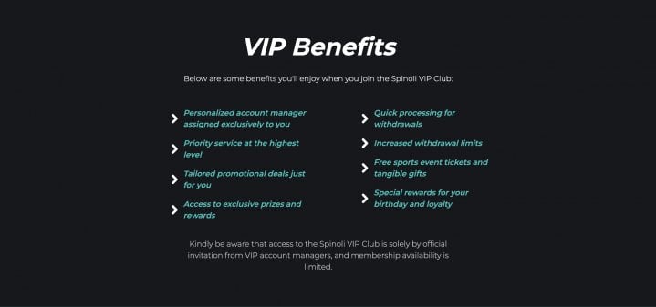 In addition to the rewards shop, there is a more traditional VIP program. Spinoli does not publicize the details of its program, and entry is by invitation only.