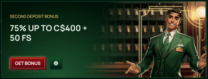 - Second Deposit: 75% up to C$400 + 50 Free Spins