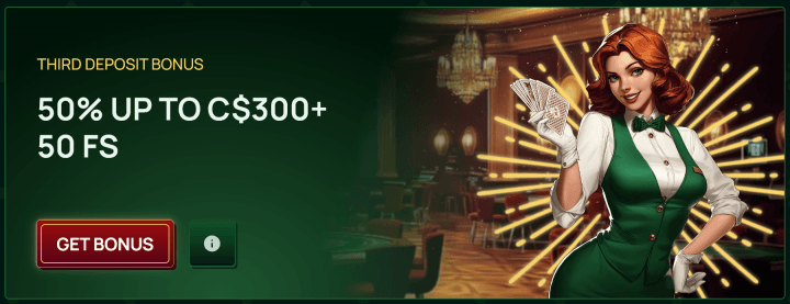 - Third Deposit: 50% up to C$300 + 50 Free Spins