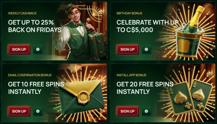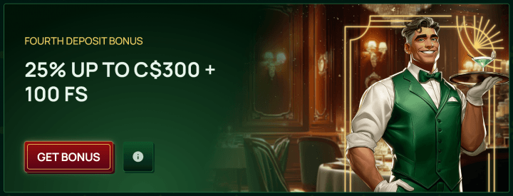 - Fourth Deposit: 25% up to C$300 + 100 Free Spins