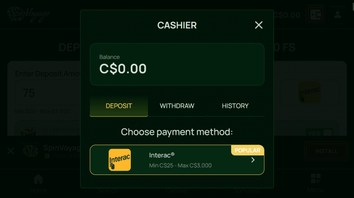 While most Canadian players will appreciate that Interac is a supported payment method at SpinVoyage, we’re not sure they expected it to be the only one available to them. Perhaps more banking options will be added in the future, but right now, Interac is the only way to deposit and withdraw.