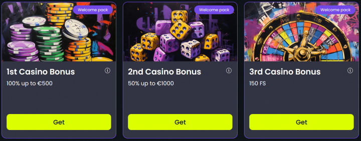 New customers work their way through the welcome package, starting with a first deposit, followed by a second deposit bonus and a free spins offer. The total welcome bonus offer is a 150% deposit match up to 1,500 EUR + 150 Free Spins.