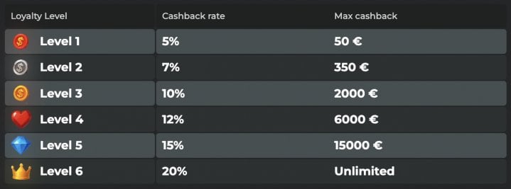 - Cashback up to 20%: Credited every Monday. It starts at 5% and goes up with your VIP level. The minimum cashback paid is 5 EUR / 7.5 CAD / 7.5 AUD / 10 NZD.