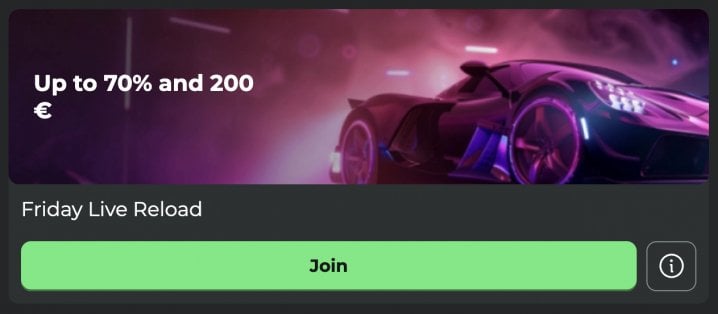 - Friday Live Reload: This one’s for live casino fans. Get a 50% to 70% bonus up to 200 EUR / 300 CAD / 300 AUD / 400 NZD, good only for live dealer tables.