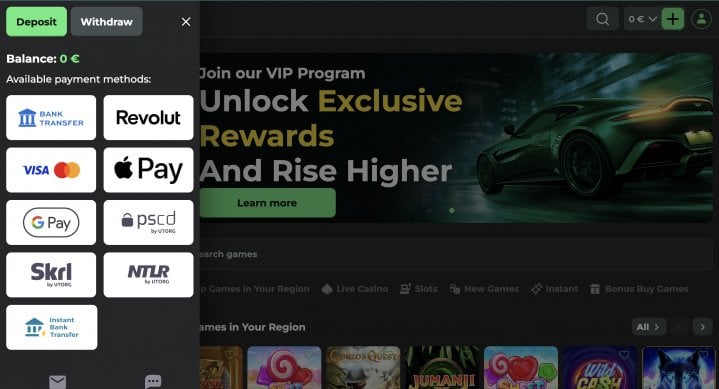 - Deposit methods: Visa, Mastercard, Revolut, Bank Transfer, Apple Pay, Google Pay, UTORG (for Skrill, Neteller, Paysafecard).