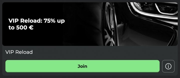 - VIP Reload: For Level 3 VIPs and up. Claim a 75% match up to 500 EUR / 700 CAD / 700 AUD / 1,000 NZD once a week with a deposit of 50 EUR / 80 CAD / 80 AUD / 100 NZD.
