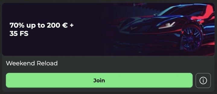 - Weekend Reload Bonus: On Saturday or Sunday, a deposit of 30 EUR / 50 CAD / 50 AUD / 60 NZD gets you up to a 70% match plus 35 free spins.