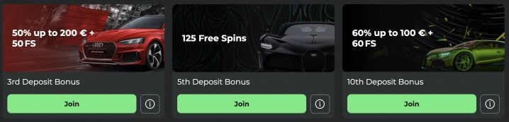 | 5th Deposit | 125 Free Spins | Max win of 150 EUR / 220 CAD / 220 AUD / 300 NZD |