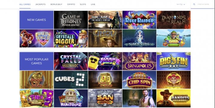 On the Surf online casino’s main page after you login, you will have the following games options ‘All Games’, ‘Jackpots’, ‘Bonus Buy’, ‘Crypto’, ‘Slots’, and ‘Live’. Also there are sections within the main casino game list so you can sort casino titles by ‘New Games’, and ‘Most Popular Games’, plus there is a ‘Find a Game’ search options, and a ‘Sort By’ options.