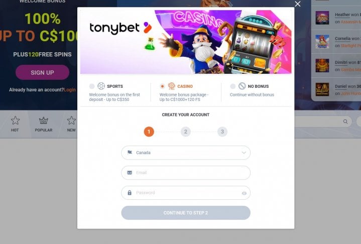 TonyBet Ontario (Canada) Casino Welcome Bonus - None for Casino