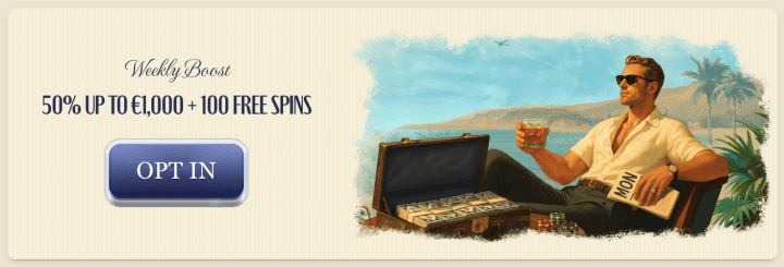 - Weekly Boost (Casino): From Monday to Thursday, you can grab a 50% match up to 1,000 EUR / 1,500 CAD / 1,500 AUD / 2,000 NZD, plus 100 spins. You need to deposit at least 20 EUR / 30 CAD / 30 AUD / 40 NZD. Just be aware that the high 35x wagering (D + B) still applies here.