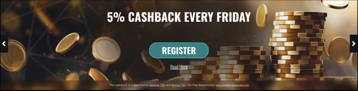 - Weekly Cashback: To be eligible for the weekly cashback, you’ll first need to be contacted directly either by email, SMS, or phone. Once invited, you’ll receive 5% back on any net losses you rack up across all games between Friday and the following Thursday. Your cashback has no game restrictions, and the amount paid on any losses is wager-free.