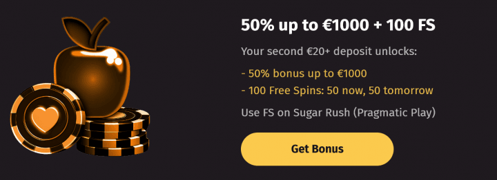 - Second Deposit: 50% up to €1000 / C$1500 / A$1500 / NZ$1500 + 100 FS – 50/day x2 (Sugar Rush)