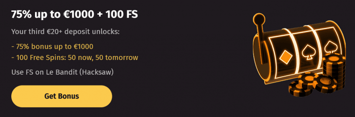 - Third Deposit: 75% up to €1000 / C$1500 / A$1500 / NZ$1500 + 100 FS – 50/day x2 (Le Bandit)