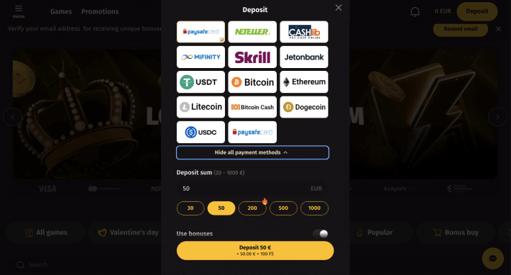You'll need at least €20 / C$30 / A$30 / NZ$30 to start. Payment options: cards (Visa, Mastercard, Maestro), e-wallets (Skrill, Neteller, EcoPayz, MiFinity, MuchBetter), vouchers (Paysafecard, Neosurf, Cash to Code, Sticpay), bank transfers through Rapid Transfer, or crypto via CoinsPaid. Fiat money hits your account right away. Crypto deposits vary – some coins like USDT arrive within seconds, while others like Bitcoin may take 2-20 minutes.
