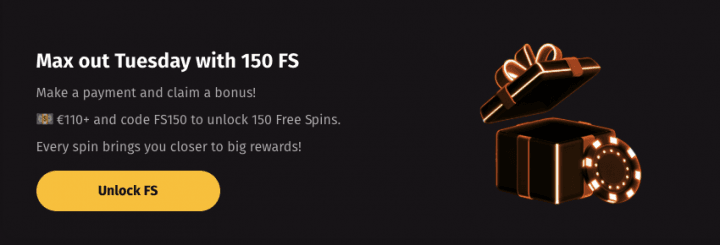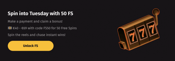 Every Tuesday, you can claim free spins based on your deposit amount. Use the corresponding bonus code with your deposit:
