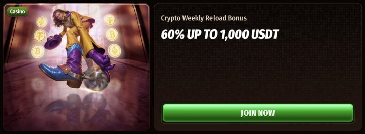 - Crypto Weekly Reload: 60% up to 1,000 USDT with a 50 USDT minimum deposit. Rollover: x30 on the bonus. Winnings are capped at 5 times the bonus amount.