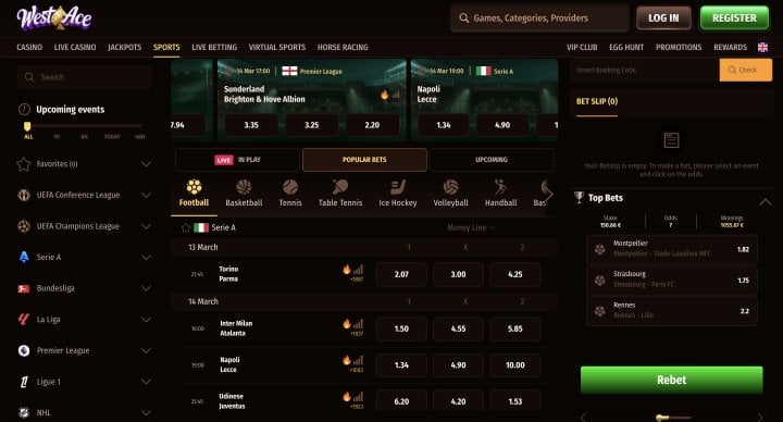 The sportsbook is surprisingly well done. WestAce offers thousands of events across football, basketball, tennis, eSports, horse racing (naturally), and less common sports like darts and cricket.