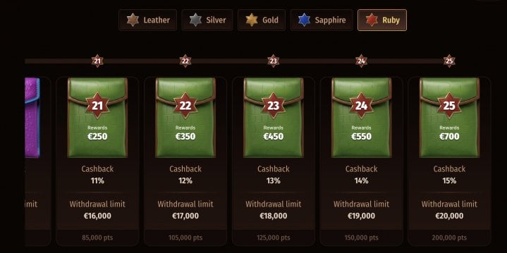 | Ruby | 2,000 EUR / 20,000 EUR | 15% daily cashback and 25% live cashback. |