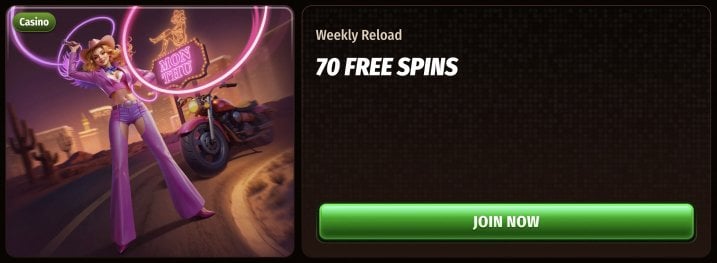 - Weekly Reload: 70 free spins with a 20 EUR minimum deposit. Rollover: x40 on winnings.