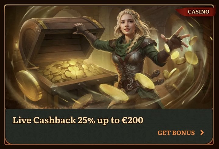 - Weekly Live Casino Cashback: Live game players can claim up to 25% weekly cashback, capped at €200 / C$300 / A$300 / NZ$400, regardless of VIP level. As with the slot cashback, the rollover is kept to a simple 1x.