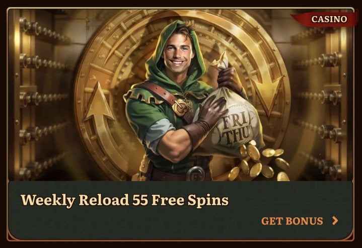 - Weekly Reload: From Monday to Thursday, you can grab 55 free spins when you deposit a minimum of €20 / C$30 / A$30 / NZ$40. Spin winnings come with a 40x wagering requirement.