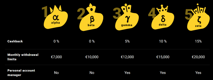 Zet Casino doesn't publish exact progression thresholds, which makes planning harder than it should be. The first two VIP levels offer little beyond basic access. Real value starts at Gamma – that's where weekly cashback kicks in, withdrawal limits improve meaningfully, and a personal account manager becomes available. Casual players depositing €100–€200 monthly will realistically sit at Alpha–Beta for some time. Delta and Zeta are high-roller territory, but the higher monthly withdrawal limits at those VIP levels are substantial enough to matter for serious players.