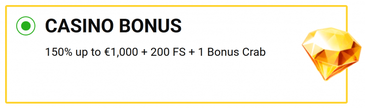 - First Deposit – 150% up to €1,000 / C$1,500 / NZ$2,000 + 200 Free Spins + 1 Bonus Crab