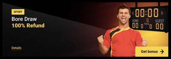 - Bore Draw Refund – 100%: Pre-match correct score, HT/FT markets refunded on a 0–0 result. Cash-out voids eligibility.