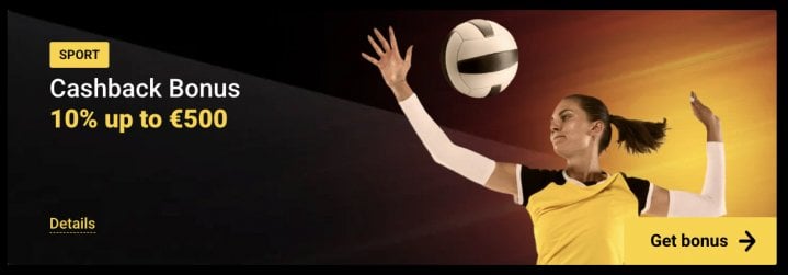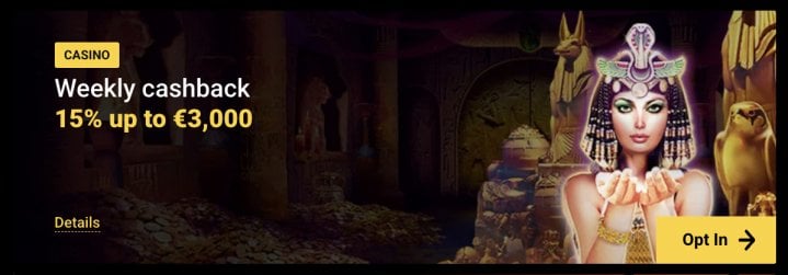 - Sports Cashback – 10% up to €500 / C$750 / NZ$1,000: Weekly, opt-in required, credited Mondays. 3x wagering on sports only. Cashed-out and void bets don't count.