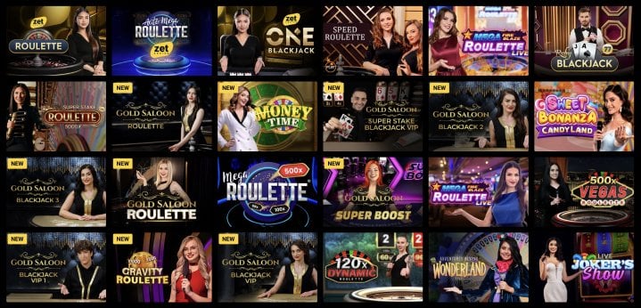 The live casino lobby is one of the stronger aspects of Zet Casino's offering. The Gold Saloon section – branded roulette and blackjack tables shared across Casolinia properties – anchors the experience, with Gold Saloon Roulette VIP, Gold Saloon Blackjack, and Gold Saloon Super Stake Blackjack VIP all present.