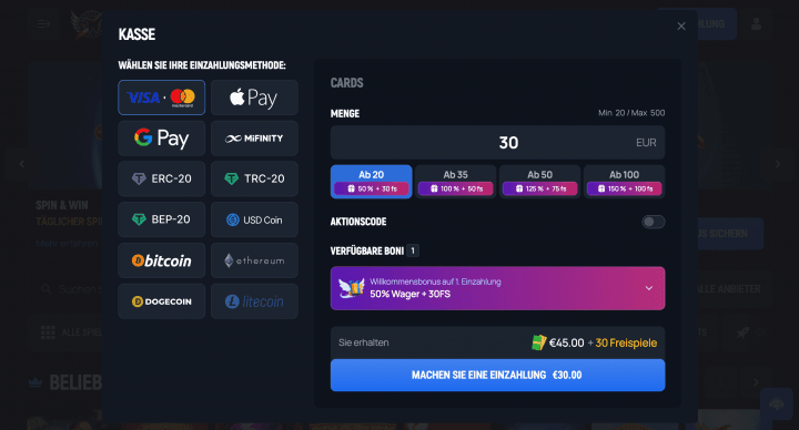 - Sobald dein neues Konto erstellt ist, öffnet sich die Kasse. Dort siehst du dann direkt den Ersteinzahlungsbonus. Aktiviere diesen, indem du die geforderte Mindesteinzahlung tätigst.