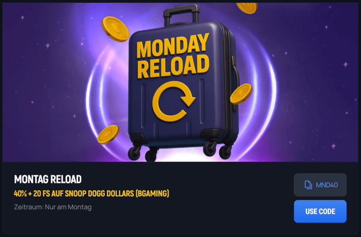 - 40% bis zu 400€ Reload Bonus am Montag (Bonuscode “MND40”)
