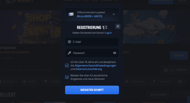 So läuft die Registrierung und Einlösung des Bonus bei Aerobet ab: