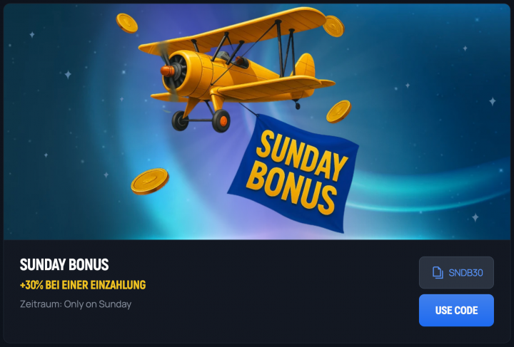 - Sunday Bonus - 30% bis zu 400€ (Bonuscode “SNDB30”)