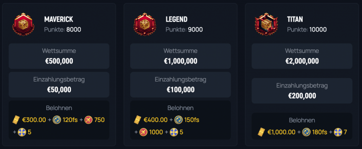 Zusätzlich dazu kannst du auch weitere Meilen sammeln. Je 100€ Spieleinsatz wird dir eine Meile gutgeschrieben. Ebenso erhältst du 5% deiner Einzahlung in Form von Meilen gutgeschrieben. Diese lassen sich dann im Treue-Shop gegen ein Bonusguthaben oder Freispiele für unterschiedliche Slots einlösen. In unregelmäßigen Abständen finden auch Spielautomaten-Turniere statt, bei denen die Top-Gewinner ebenfalls Meilen erhalten.