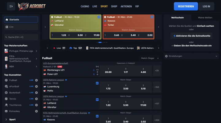 Neben dem Casino Bereich bietet Aerobet auch ein breites Wettangebot. Du findest hier klassische Sportwetten mit vielen unterschiedlichen Wettmärkten, sodass du nicht nur auf Ergebnisse, sondern auch auf zahlreiche Details innerhalb eines Spiels setzen kannst. Die Auswahl ist groß genug, damit du nicht nur auf die Standardmärkte beschränkt bist.