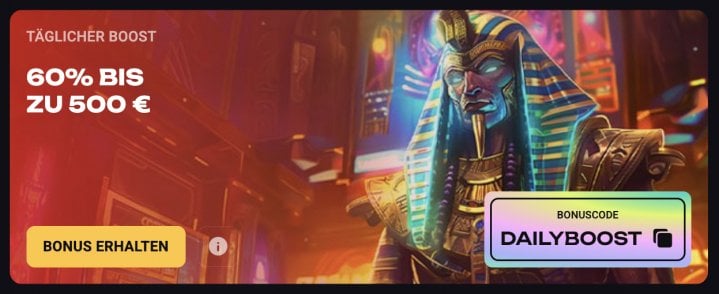 - Täglicher Boost – 60% bis zu 500€, einmal täglich auf die 3. Einzahlung
