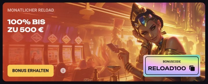 - Monatlicher Reload – 100% bis zu 500€, einmal monatlich anwendbar